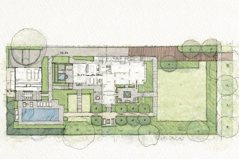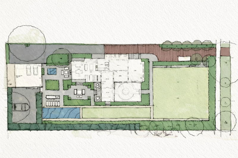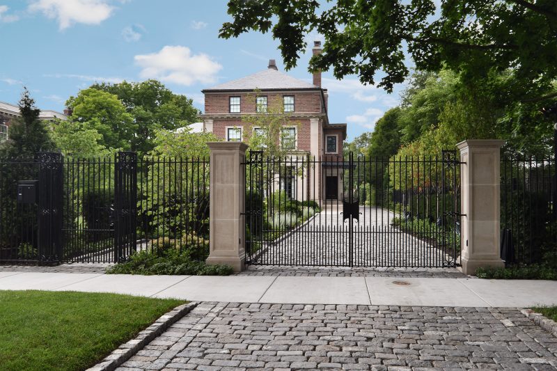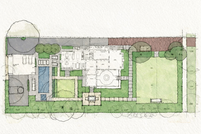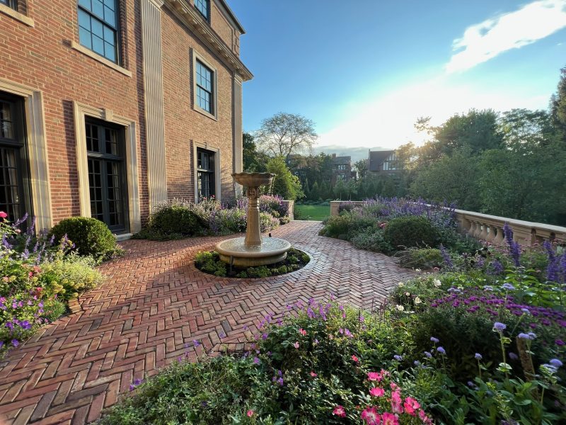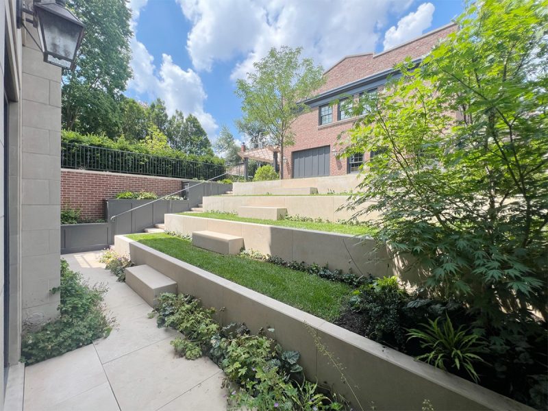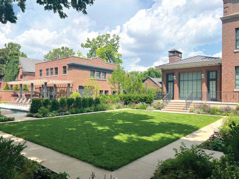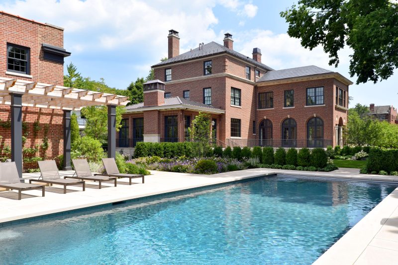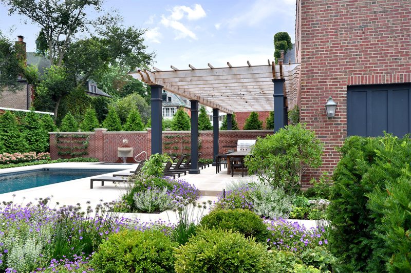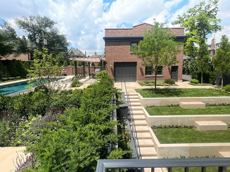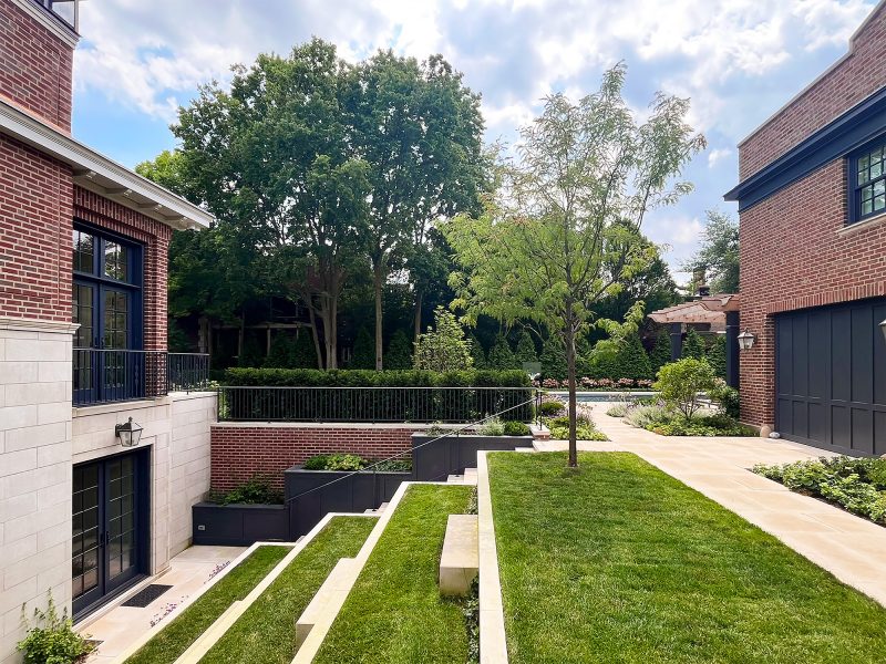 This historically significant estate underwent a massive renovation alongside the careful restoration of the 1904 home by renowned original architect Howard Van Doren Shaw. The design team worked closely together to balance traditional touches with modern updates to function for the busy family. Lawn panels with layered perennial borders and stone bandings, limestone water features, and boxwood hedging are a nod to the home’s formal roots. A crabapple allee frames a strong east-west axial corridor from the front garden to an intricate spa spillway. The pool garden with a pergola covered dining area and the firepit lounge space update the property for daily living and hosting gatherings. Circulation was prioritized from the entertaining terraces to the basement level family room to allow for easy movement between spaces. This lower sunken courtyard evolved into lawn tiers with limestone slab walls providing a striking view from inside and also a lively play space. Entry limestone piers with custom iron gates and fencing, perimeter arborvitae hedges, and upright trees impart privacy for the family on a very visible property.
